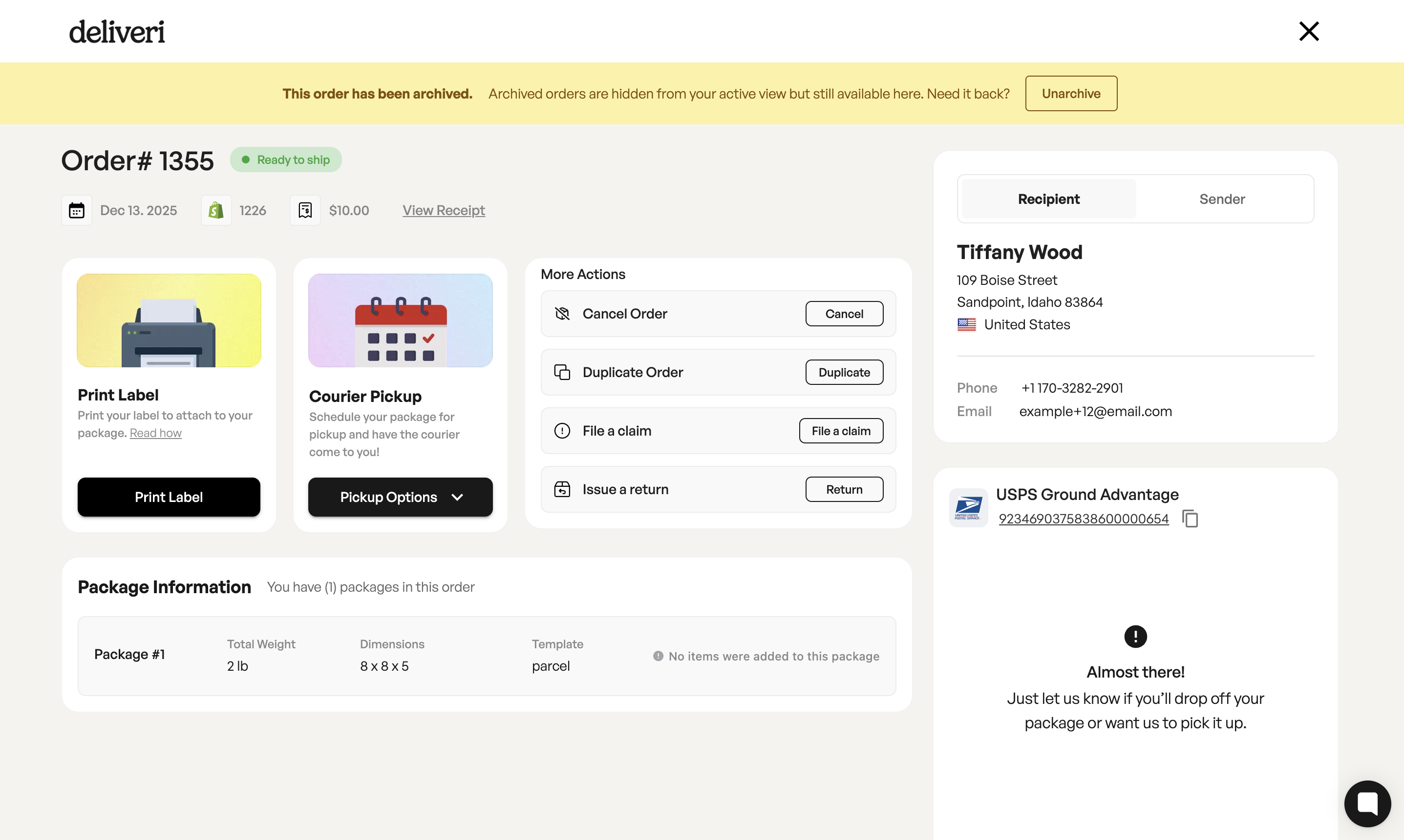 Note: Archived orders display a yellow banner indicating their status and include an Unarchive action.