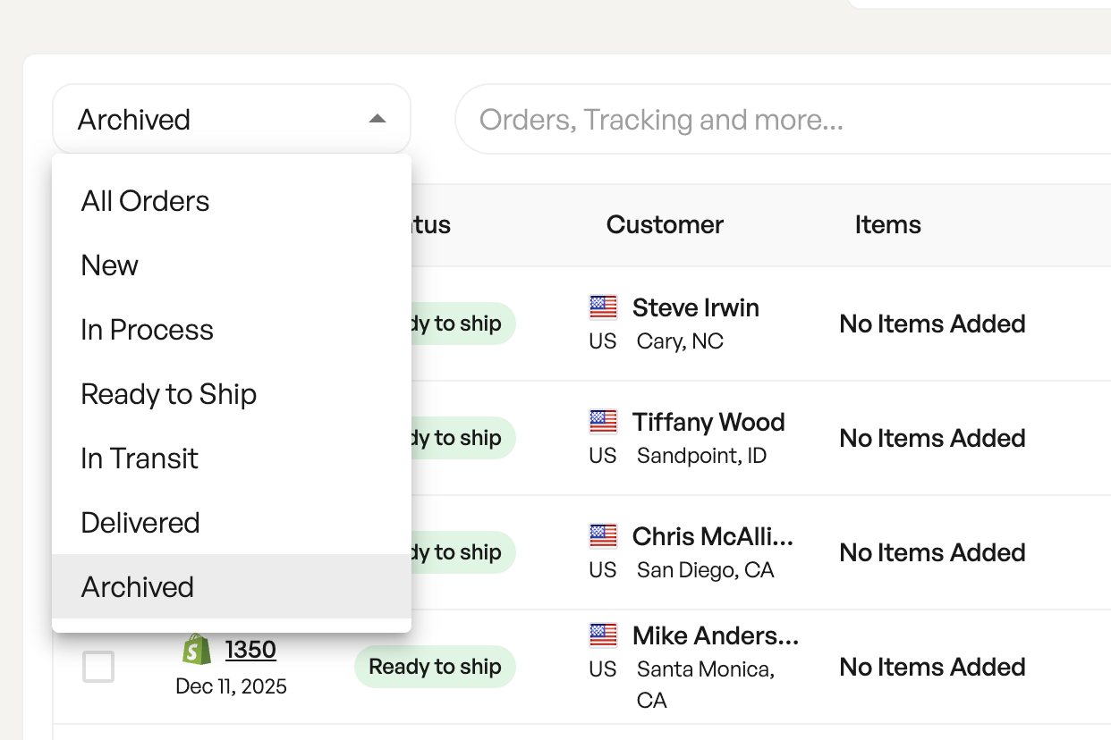 The order remains searchable and viewable by selecting “Archived” in the filter dropdown.